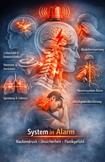 Die Halswirbelsäule ist eine der sensibelsten Regionen unseres Körpers. Sie trägt nicht nur den Kopf, sie steuert Orientierung, Gleichgewicht, Schutzreflexe, Muskelspannung, Atmung und einen großen Teil unserer neurologischen Sicherheit. Wenn dieses System instabil wird – sei es durch Unfall, Überlastung, muskuläre Dysbalance oder chronische Verspannung – reagiert der Körper nicht „ein bisschen empfindlich“. Er reagiert mit einem kompletten Sicherheitsprogramm.